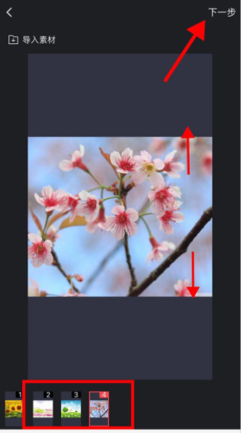 3、用户可以在其中替换四张图片或者视频素材,然后点击下一步继续编辑,让大家轻轻松松完成制作,将视频分享发布到抖音APP里。
