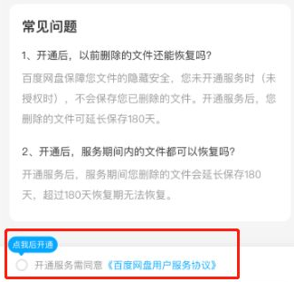 在商品购买页,勾选授权同意网盘服务协议,点击“立即开通”进行支付流程,购买成功后回收站中的文件可延长保存180天,保障期1年。