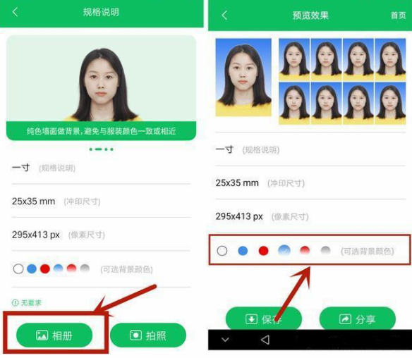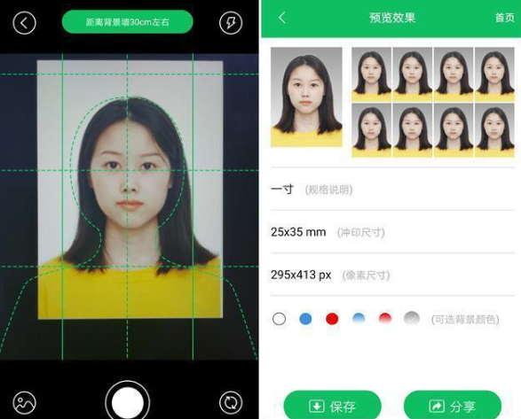 图片拍摄好之后,选择需要的背景色,点击"保存"。一张专业又好看的证件照就制作好了。