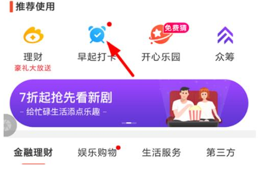 2、进入到微博钱包功能界面之后,我们就可以选择功能列表里的“早起打卡”功能了,选择该功能就可以顺利进入到活动界面开始报名。