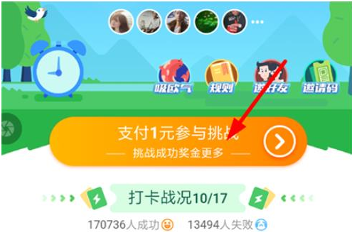 3、通过“支付1元参与挑战”的选项,大家就能参与早起打卡的活动,在第二天的早晨5点至8点进入微博打卡,即可获得1元至201元的随机现金奖励!
