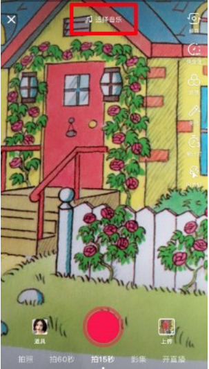 1、打开抖音之后,点击+号键,选择拍摄以及点击背景音乐的选择;