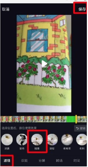 8、然后将黄色的线拉到音乐的变切点,之后在滤镜的特效中向左滑动,找到摇摆,按住一会之后点击添加摇摆特效即可完成。