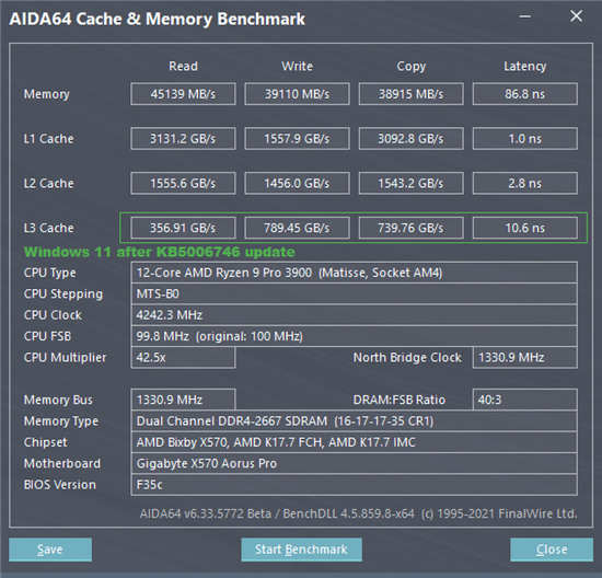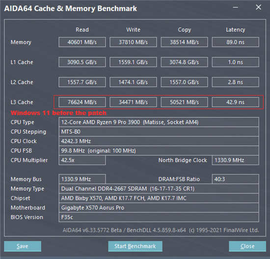 该问题是由 Windows 11 引起的,主要是由于一些兼容性错误,导致 AMD L3 缓存访问延迟增加和性能下降。