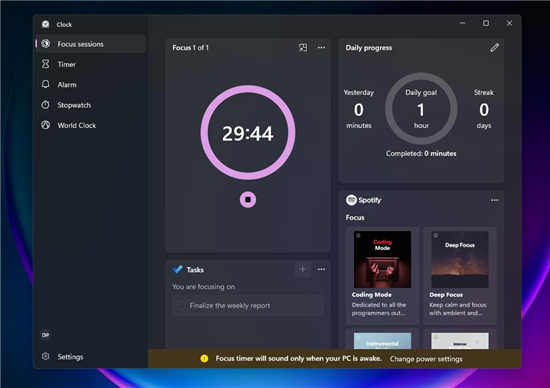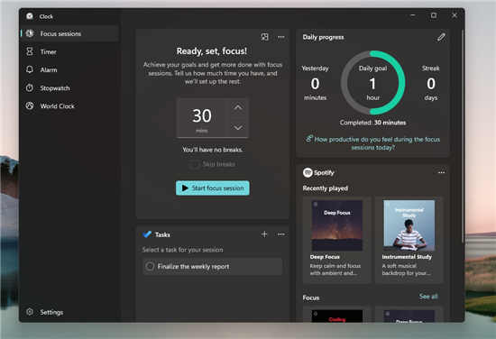 Focus Sessions 功能是操作系统原生时钟应用程序的一部分,其想法很简单:设置一个计时器,从微软待办中挑选你的任务,选择你最喜欢的音乐,然后一直工作到它用完为止。你也可以休息一下,循环重复这个过程,直到你的工作结束。