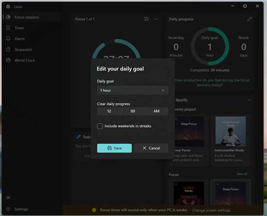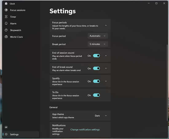 完成后,告诉 Microsoft 您有多少时间,Windows 将设置其余时间。您可以访问时钟应用程序的设置来更改计时器持续时间并启用或禁用待办事项和 Spotify 集成。