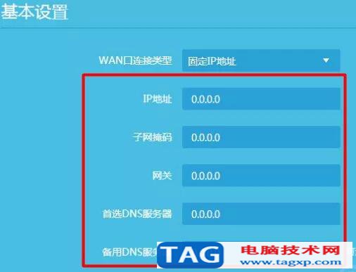 当路由器的“上网方式”选择:固定IP地址 时,需要填写正确的 IP地址、子网掩码、网关、首选DNS、备用DNS 信息。