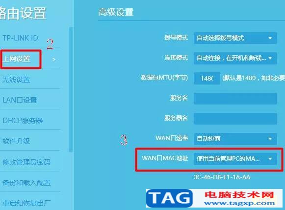 请在你自己路由器中,找到“MAC地址设置”、“WAN口MAC地址”等选项,然后选择:当前管理PC的MAC地址 即可。