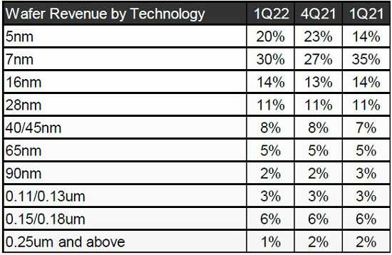 2022年第一季度,5nm工艺占晶圆总收入的20%,7nm工艺占30%,先进工艺占晶圆总收入的一半。在目前台积电的定义中,7nm以上的先进工艺称为先进工艺。台积电表示,2022 年第一季度高性能计算和汽车相关需求非常强劲,预计将继续支撑其第二季度收入,抵消智能手机季节性调整的影响。