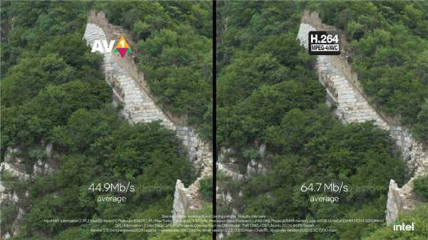 该卡的性能数据尚未公布,但英特尔展示了 AV1 和 H.264 格式的视频码率对比。在相同的视频质量下,AV1的视频码率为44.9Mb/s,而H.264格式为64.7Mb/s,节省30%的流量。这为用户和服务提供商节省了大量流量。