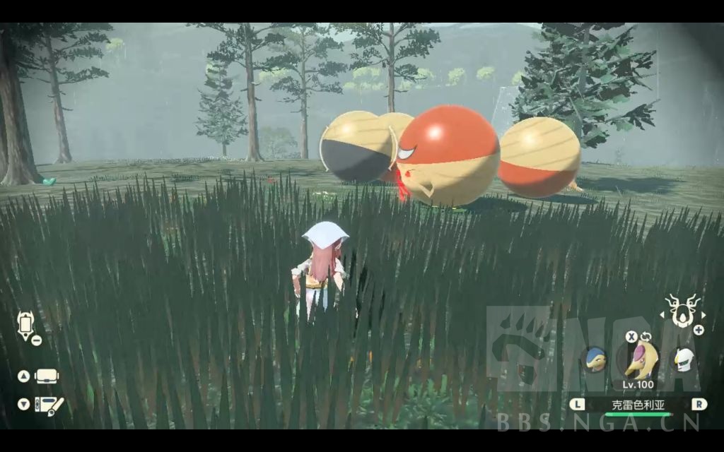 当然这难不倒机智的洗翠投掷猴,由于附近有草地,我们带上矿诱团和匿声喷雾,将雷电球和顽皮弹勾引到附近再拉入战斗。要注意控制距离,最好在雷电球开吃的时候就能直接丢到黏丸。