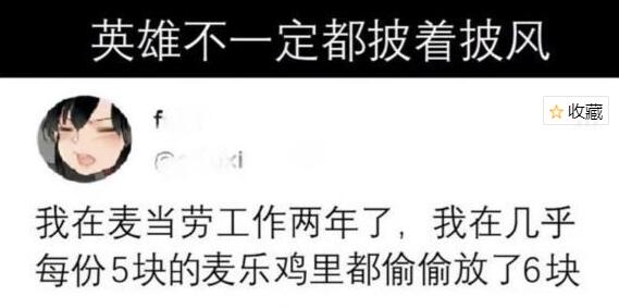 因此啊这个默默为大家付出的小个儿被称为在黑暗中的英雄麦乐机匣当然有正义就会有邪恶。这个名叫开心就好的网友在麦当劳兼职期间,每次都会偷吃一块麦乐鸡,因此被称为麦乐鸡贼。坑爹呢。这是正所谓物以类聚,人以群分,其他黑暗势力也渐渐浮出水面。我是一名老师,每次讲课都会多讲十分钟。我我是开公交的,每次都会多送乘客一站啊,我是火化炉工,每次都会多烧兄弟你十分钟。