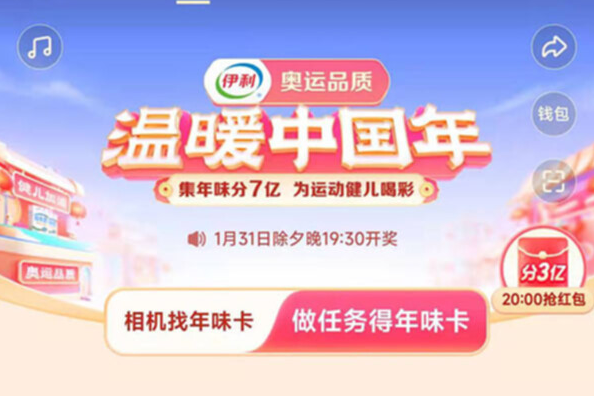 ●第一阶段-集5张年味卡活动:集卡期间,集齐“压岁钱”“贴春联” “拜新年” “办年 货”“年夜饭”一套共计5张年味卡(下称“第一阶段年味卡”),可获得第一阶段集年味开奖资格,在开奖时间瓜分3亿红包。