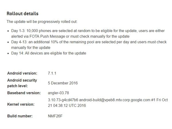 另外,沃达丰澳大利亚还表示,Google将于12月6日为华为Nexus 6P手机推送安卓7.1.1,体积约650MB,含安卓7.1/7.1.1的各项新功能以及12月份安全补丁。