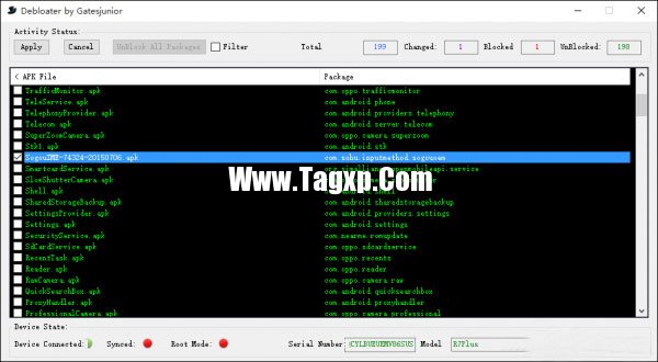 用Debloater软件删除的APP还可借助该软件恢复,方法是点击Read Device packages 获取设备上安装的应用列表后,找到删除的软件,去掉勾选再点击Apply按钮。如果真的出现误删文件无法开机的问题,可以进入Recovery刷入完整的ROM包解决。