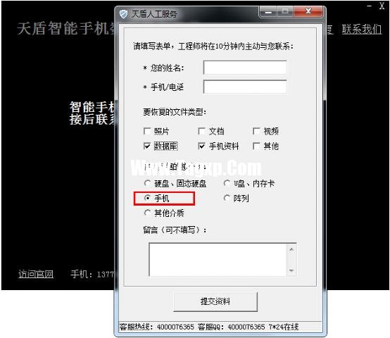 第六步:填写人工服务表单,天盾数据恢复中心的工程师会尽快跟用户联系,为用户解决手机数据丢失问题。