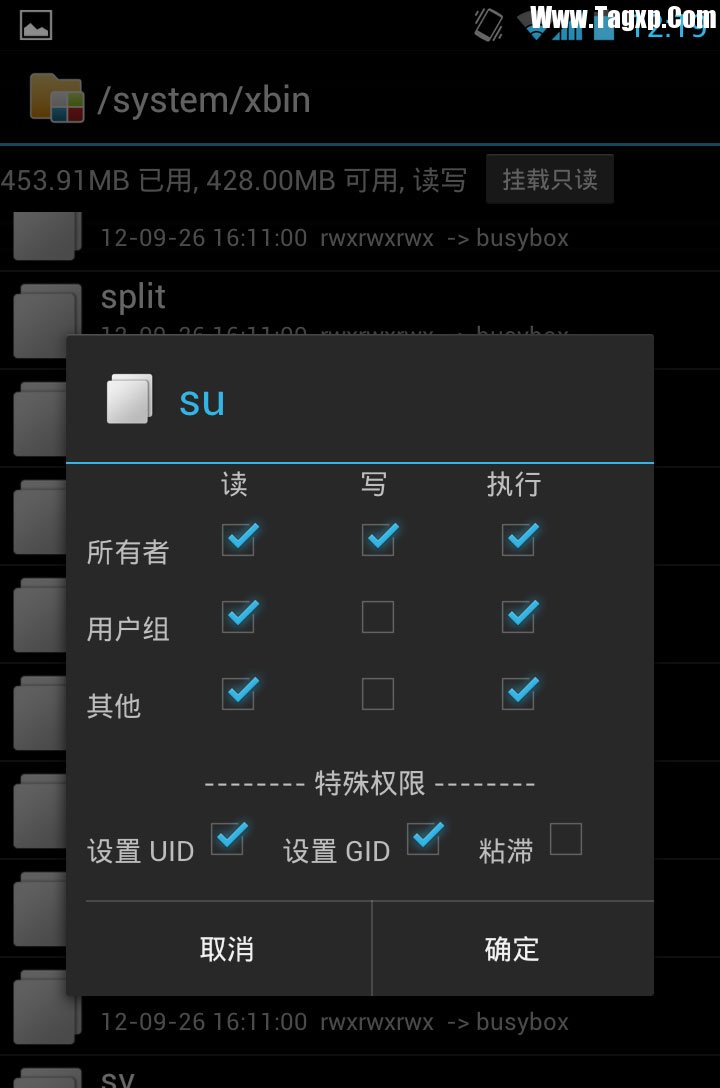 第二步:把解压得到的su文件用re管理器放到 /system 路径下,修改权限6755(如图),特殊权限前两项打勾,改完权限将su文件移动到 /system/xbin下替换原来的su文件。