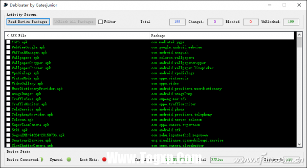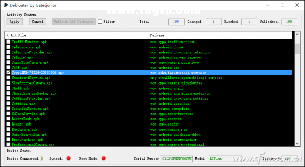用Debloater软件删除的APP还可借助该软件恢复,方法是点击Read Device packages 获取设备上安装的应用列表后,找到删除的软件,去掉勾选再点击Apply按钮。如果真的出现误删文件无法开机的问题,可以进入Recovery刷入完整的ROM包解决。
