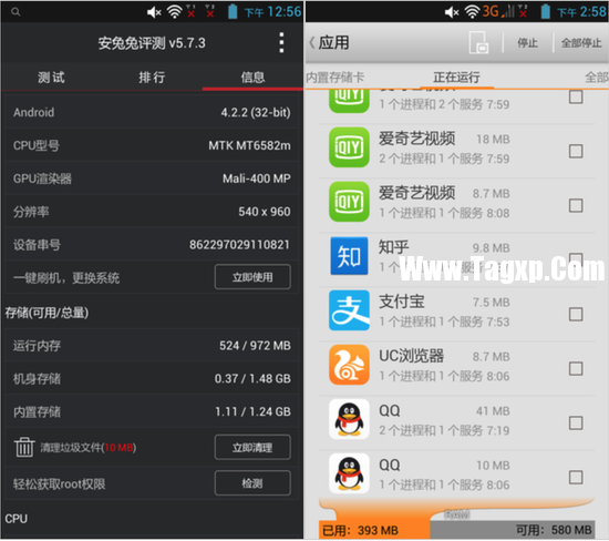 实验机型配置:MT6582m@1.3GHz+1GB RAM,安卓4.2.2。实验所用手机在2013年7月发布,笔者也使用了一年有多,最后因为机器实在太卡顿最后被放在抽屉里铺尘。