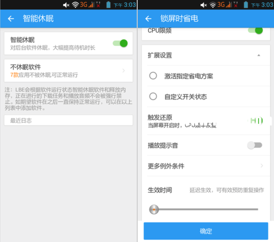 在节电优化中的;智能休眠”以及;锁屏时省电”同样推荐开启,前者可以根据软件的运行状态自动休眠释放内存,用户同样可以设置不进行休眠的软件。而;锁屏时省电”可以在用户锁屏时进行后台程序的清理(智能加速中白名单中的程序会保留),笔者建议激活;清理后台应用”、;CPU限频”功能,激活;触发还原”并且综合自动锁屏时间来设置上述功能的;生效时间”。