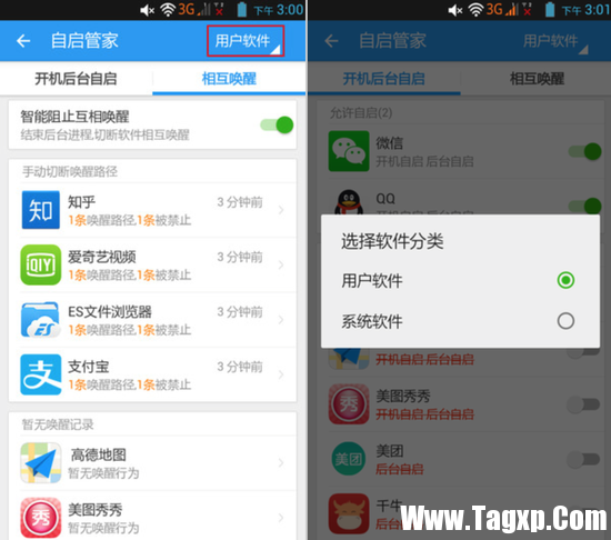 ;相互唤醒”可以切断软件之间相互唤醒的桥梁,但;相互唤醒”需要在使用一段时间后才能监控出唤醒状况,所以先设置好;开机后台自启”之后,正常使用手机若干小时后便可返回LBE继续进行;相互唤醒”的设置,在此需要注意的是保留一些必须关联的唤醒,例如支付宝会被淘宝唤醒,这是正常的,因为我们用手机淘宝买东西需要转跳支付宝应用界面,所以这一类相互唤醒无需禁止。