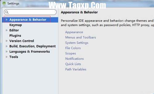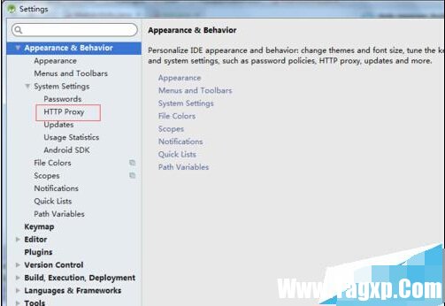 4、点击;appearance & behavior”完,就会展开进行system setting的选项之后选项内的HTTP proxy的选项。