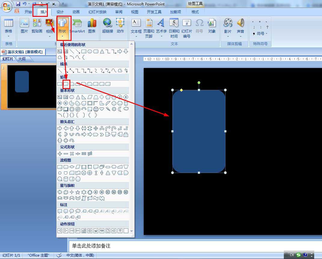 设置PPT为空白,背景为黑色——点击插入——形状——选择圆角矩形。