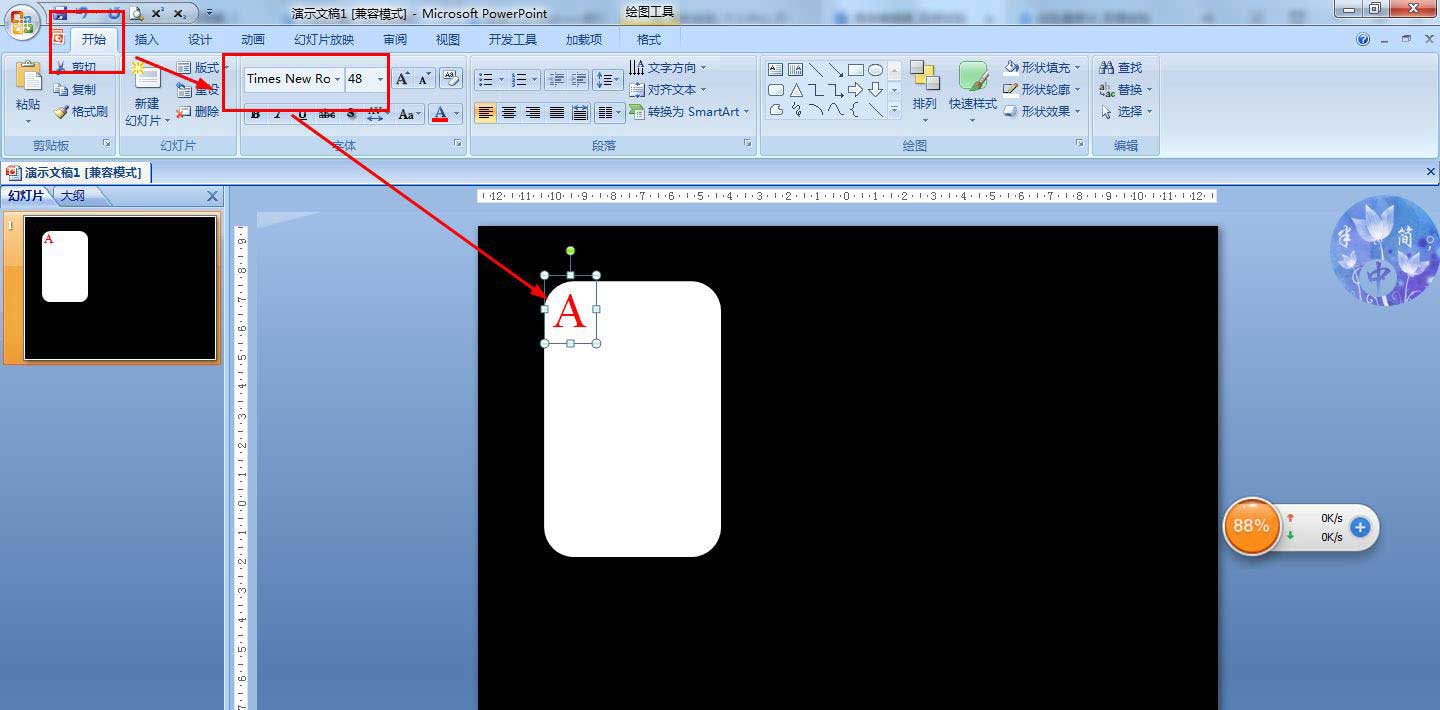 复制字母A,移动到矩形右下角——选择复制字母A的文本框,点击格式——放置——垂直翻转,调整好位置。