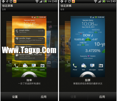 手机品牌都有各自不同的桌面,例如HTC的Sense,等等,一般在手机出厂时都会自带几款的主题。HTC Sense界面除了可以让桌面放置很多精美的插件之外,在手机锁定屏幕的定制化程度也非常的高。无论是日程提醒,还是社交网络状态,或者是天气信息和股票价格等等等等,都可以根据你的喜好进行个性化定制