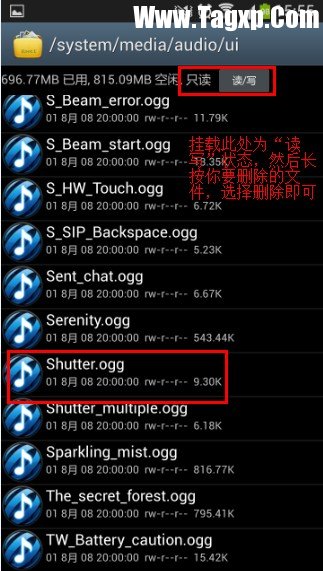 2、依次打开 system/media/audio/UI/ 看到shutter.ogg文件,将其删除即可。如果删除时提示不能删除请先挂载权限后再删除!