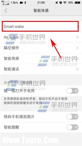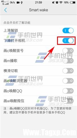2)点击【Smare wake】一栏进入,开启【下滑打开相机】右边按钮即可。(如下图)