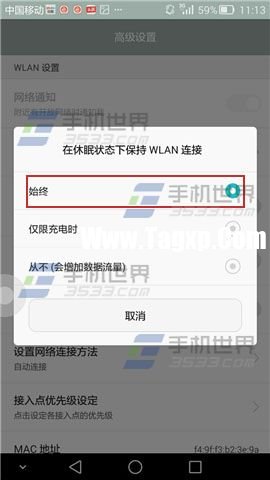 3)点击【高级设置】,把【在休眠状态下保持WLAN连接】选项设置成【始终】就可以了。(如下图)