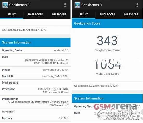对比此前曝出的配置信息,我们发现三星galaxy grand prime超值版的处理器已经由64位四核Cortex A53 Marvell PXA1908处理器换成了展讯(Spreadtrum)的SC8830处理器。