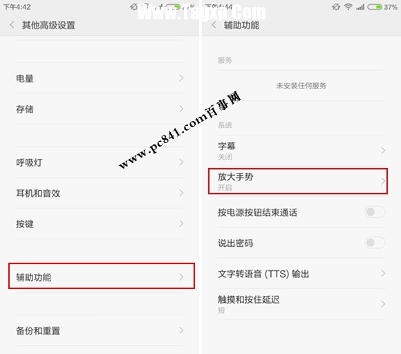 二、进入其他高级设置后,我们再其底部找到并进入【辅助功能】设置,然后开启放大手势操作功能即可,如下图所示。