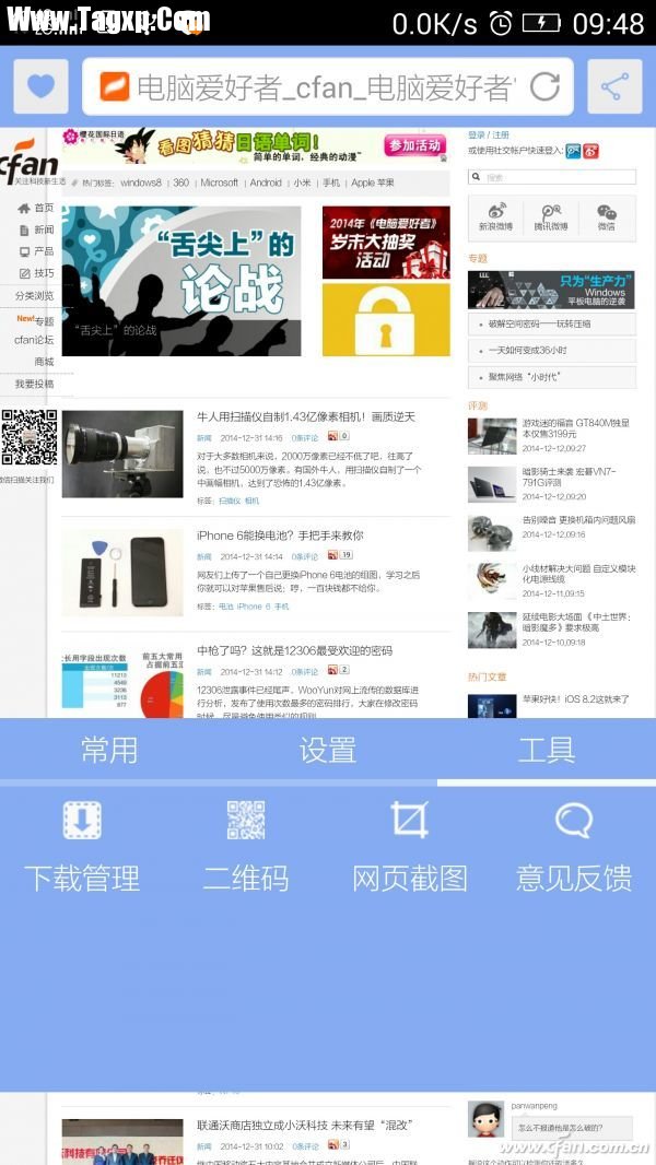 APC浏览器虽然支持全网页截图,但它对于某些有横幅滚动网页的支持并不太理想。因此,截图时请务必处于网页页首操作,最大程度避免图片错位的发生。