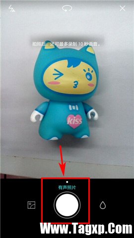 2)进入后再点击红色边框内的【圆圈】拍照,拍完照自动录音,最多可录制10秒声音,也可以点击【蓝色圆圈】提前结束。(如下图)