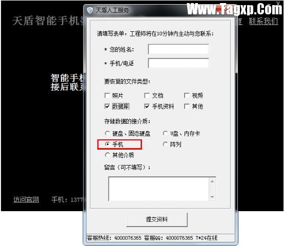 第六步:填写人工服务表单,天盾数据恢复中心的工程师会尽快跟用户联系,为用户解决手机数据丢失问题。