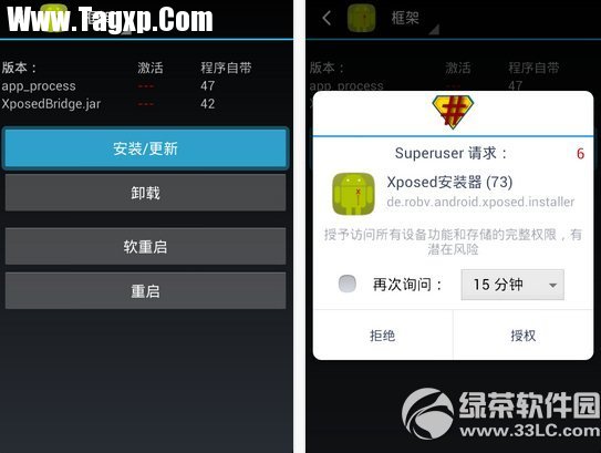 点击后进入框架安装、升级界面,我们点击;安装/更新”,会出现ROOT授权提示,许可即可。这里小编给大家个提醒,为了Xposed 框架及以后各种模块的良好运行建议使用好的授权管理,目前各种一键ROOT生成的各种授权管理程序可能无法满足Xposed 框架及以后各种模块的需求。建议使用SuperSU Pro。Xposed 框架安装完成后重启手机才能激活,可直接点击重启也可手动重启。