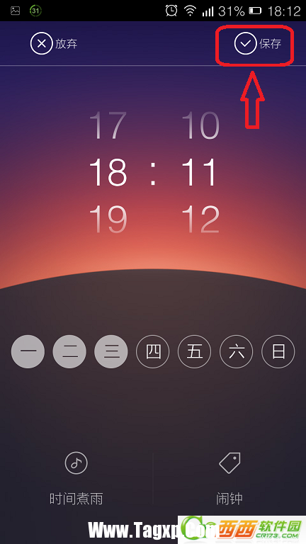 2.然后会出现时间供你设置,时间就是闹钟的时间,可以自己随便选择几点几分,别忘了选择设置时间的日期(图中划线处)和铃声(图中框处),如图: