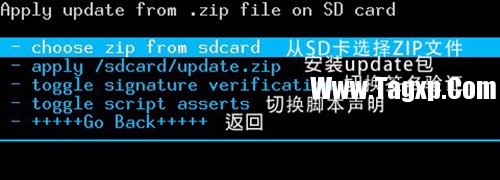 3)接下来就是开始刷入zip格式的刷机包了,按音量键选择install zip from sdcard确认,然后再按音量键选择choose zip from sdcard,然后确认,接下来按音量键移动光标找到之前放入SD卡根目录的刷机包,然后选择Yes – Install XXXXX.p-确认开始刷机。