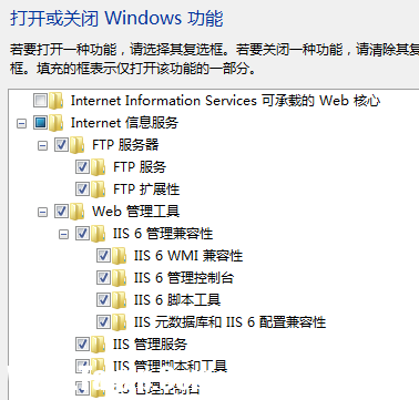 1、开始-控制面板-程序-打开或关闭Windows功能,如果是控制面板经典视图,则直接点击程序和功能-打开或关闭Windows功能,打开Internet信息服务中的FTP服务器和Web管理工具(以及以下所有的子选项,见图)。