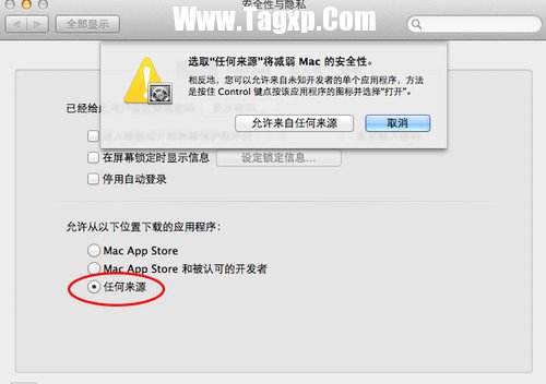 3、选择;任何来源”,然后点击允许来自任何来源,这样就不会出现;软件已损坏”或;不是Mac Appstore下载的”的提示了。