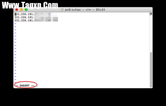 屏幕上会提示你输入密码(输入密码的时候不会有任何字符显示,甚至*都不会显示,输完之后按回车就是了),打开 hosts 文件之后按 i 键进入插入模式(可理解为编辑模式,如下图所示,会有「INSERT 」提示,即可插入编辑的意思),然后按照你的需要对该文件进行编辑,编辑完成之后按 ESC 键退出插入模式,之后按「 :wq+回车」保存退出,记得英文的冒号也是要输入的哦。