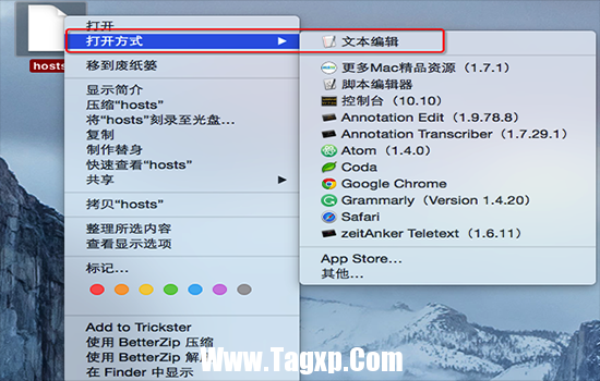 第四步、复制这个「hosts」文件到桌面上,鼠标右键点击/右击它,选择「打开方式」—「文本编辑」,打开这个「hosts」文件,然后将你要修改的内容直接在里面修改就好了。