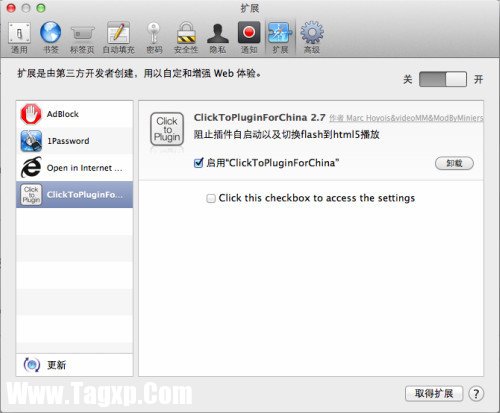 访问Safari扩展页,勾选 ;Click This checkbox……”弹出设置页面
