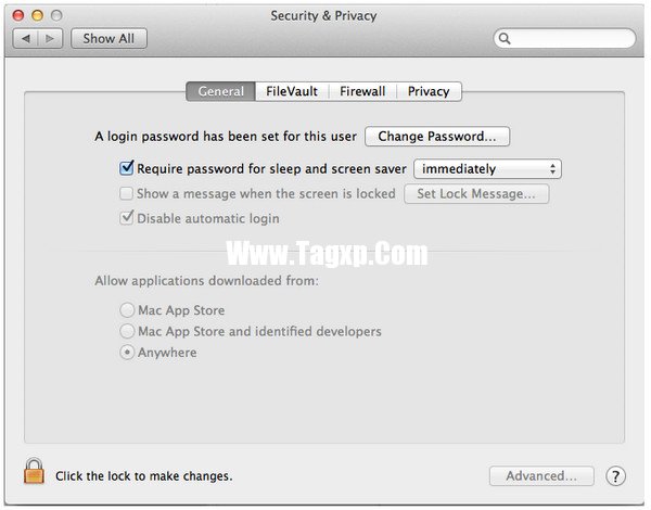 2. 然后在System Preferences里面的Security里面的General标签选择;Require password to week this computer from sleep or sreen saver.”选项。