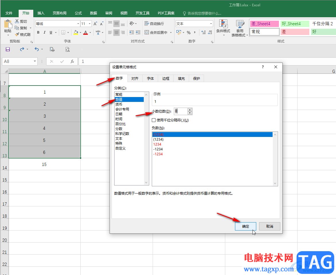 第四步:在窗口中的“数字”栏,点击选择“数值”,根据需要设置小数位数并确定,然后重新输入数据;