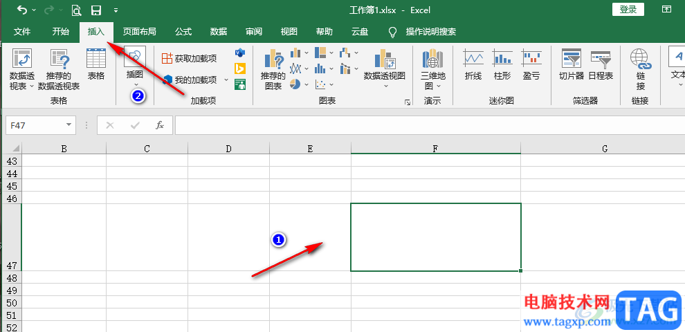 2、第二步,进入Excel页面之后,我们在该页面中先将表格大小进行调整,然后打开“插入”工具