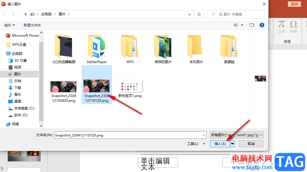 3、第三步,进入文件夹页面之后,我们在该页面中找到自己需要的图片,然后点击“插入”选项