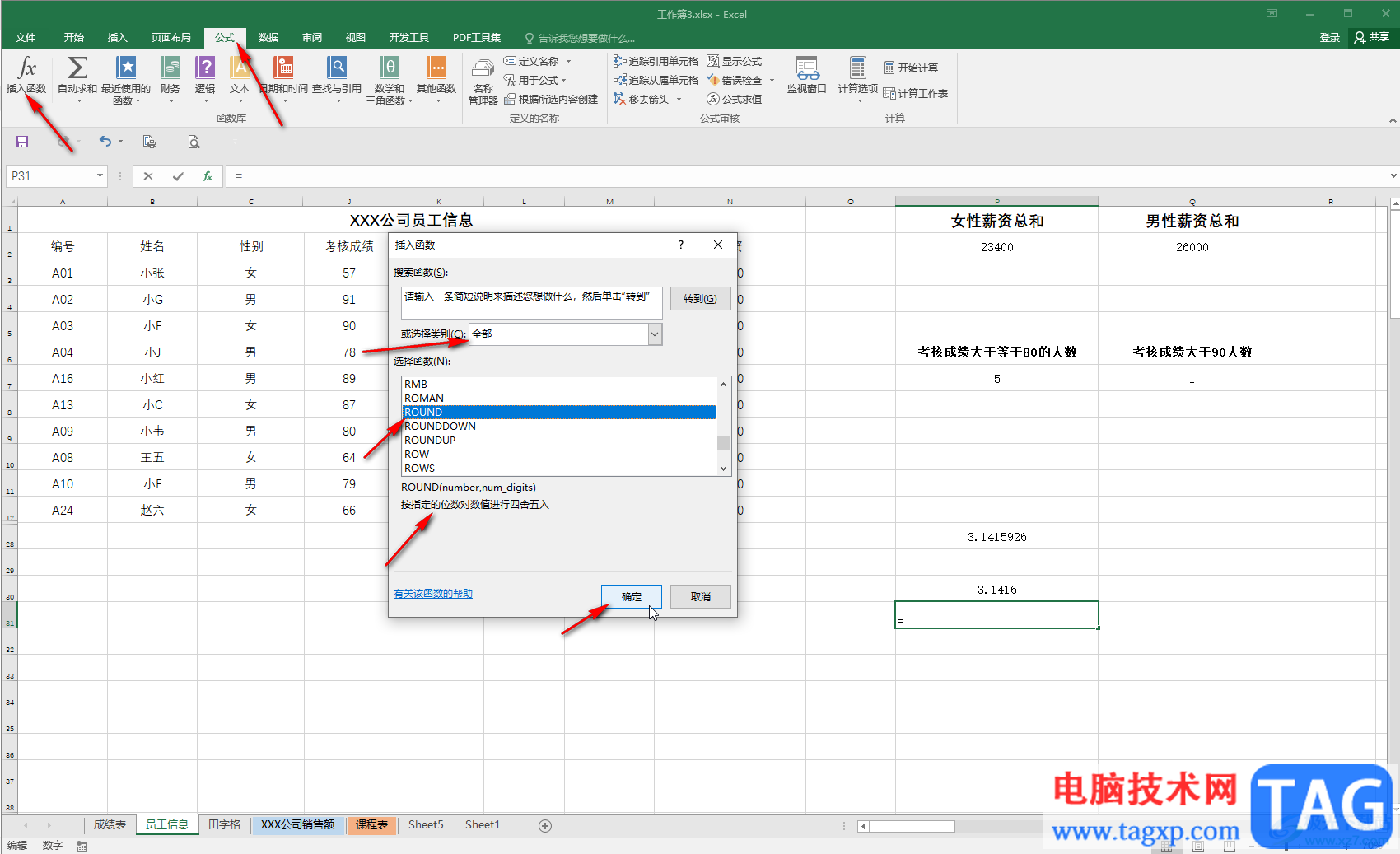 第五步:另外,我们也可以在“公式”选项卡中点击“插入函数”按钮后,在打开的窗口中选择“全部”,然后找到并点击round函数,可以看到提示信息,点击确定后根据提示操作就可以了。
